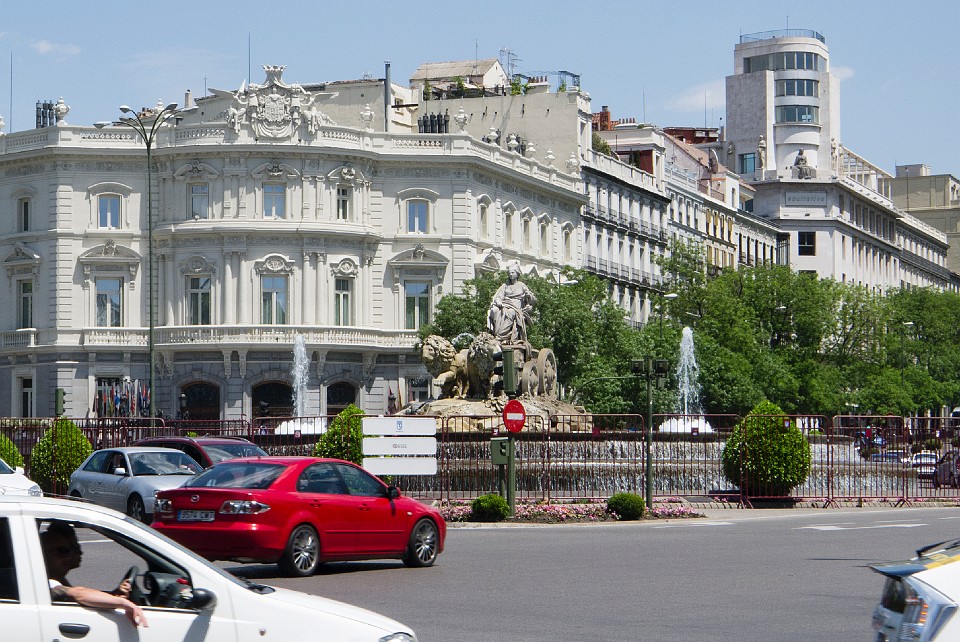 Madrid 2012 -236  Die Plaze de Cibeles, ein Springbrunnen. : Madrid Madrid 2012 -237  Banco Espana an der Placa de Cibeles. : Madrid Madrid 2012 -238 : Madrid Madrid 2012 -239  Blick in Richtung auf die Gran Vía, links das berühmte "Metropolis"-Gebäude. : Madrid