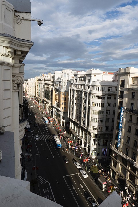 Madrid 2012 -249  Auf dem Dachgarten unseres Hotels - hoch über der Straße. : Madrid Madrid 2012 -250  9. Stock. : Madrid Madrid 2012 -251  Blick auf die Gran Vía von oben. : Madrid Madrid 2012 -256  Und zum Norden hin mit den futuristischen Gebäuden des Bankenviertels. : Madrid