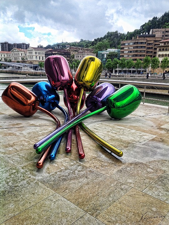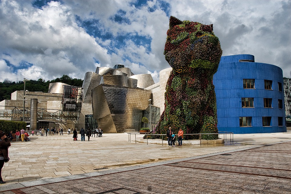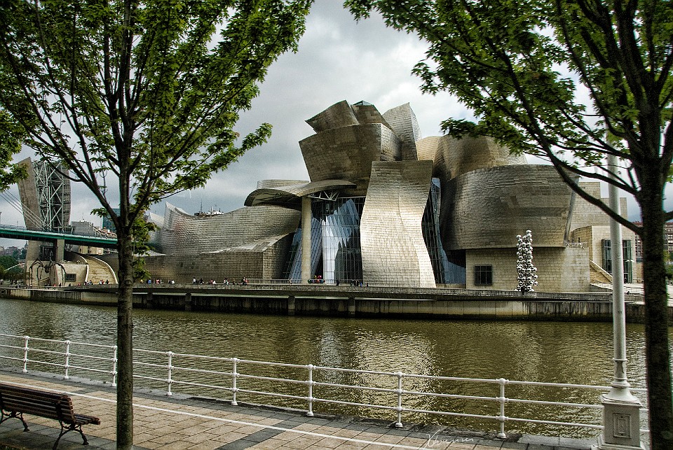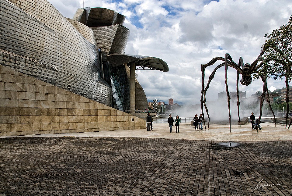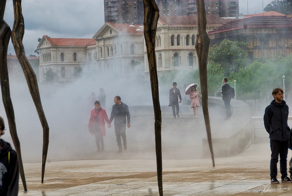 2 In Bilbao besichtigen wir das von Frank Gehry entworfene Guggenheim-Museum. Der Nebel (Wasserdampf) verleiht den Kunstwerken etwas Mystisches.